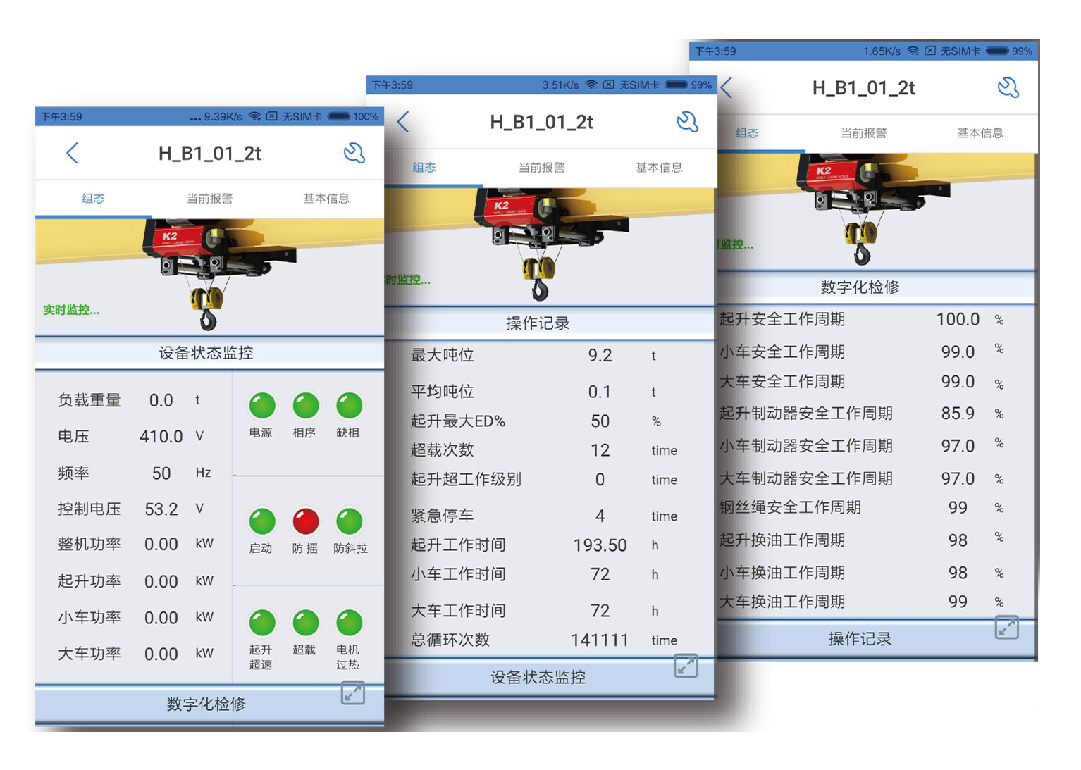 智能安全监控器是起重机运行管理、安全保护和维修维护的专用监控设备,起升机构的所有控制信息、运行状态、重量信息、限位情况等连接至智能安全监控器,智能安全监控器自行处理所有信息,在安全的情况下给出指令,指挥起升机构运行,同时对重要输入、输出信息进行记录,并可自动计算SWP(安全工作周期),客户可在任意终端,如手机、平板电脑、电脑等对起重机的运行状态、监控数据、历史数据、故障信息等进行远程监控。