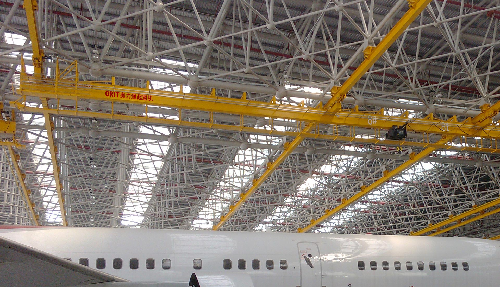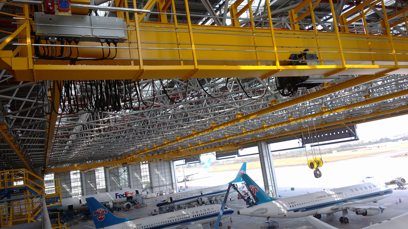 应用于飞机制造工厂、飞机维修机库、飞机喷漆机库、飞机拆解机库,适配A380、A330、B747、B787、C919、C929、Y20等全系列飞机,最大跨度90米,最多7支点。 ○ 自重轻、轮压小、高度矮