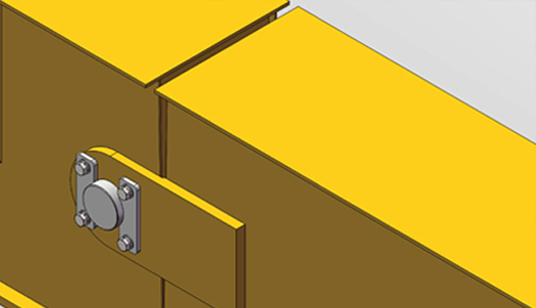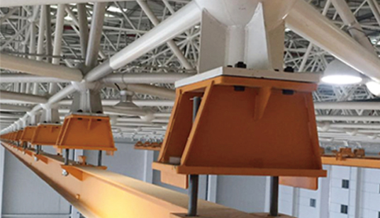 专利技术: 奥力通发明专利技术(ZL 2009 10143701.X)吊点新设计为“柔性吊点”,是在原来的刚性吊点基础上增加吊杆和关节球轴承的可调部分,关节球承选用自润滑型,免维护设计,吊杆选用高强特制螺杆,连接强度高,便于轨道垂直方向调节;有效减小网架变形对起重机的影响。具有水平位移自动纠正功能;具有自适应性,避免啃轨;设计简单、制作方便、成本低廉。柔性主梁可有效减小侧向应力,避免啃轨,保证运行更加平稳。