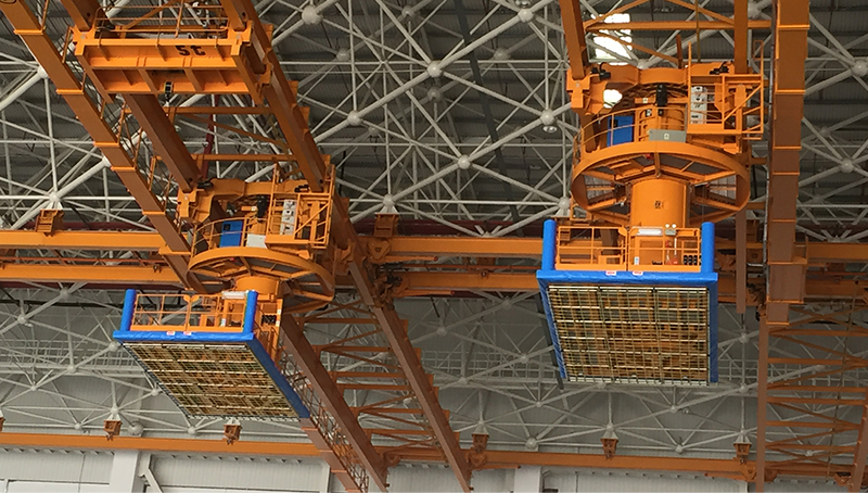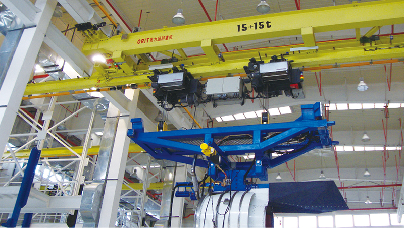 应用于飞机发动机制造工厂、飞机发动机维修工厂、飞机发动机试验工厂,单梁、双梁、三梁等多种吊装方案适配各型航空发动机。过跨、道岔、转轨器等等多种上部分路满足各种工艺布局,最大起重量达到35t+35t。 ○ 智能操控,自动插拔销,自动装卸,运行平稳