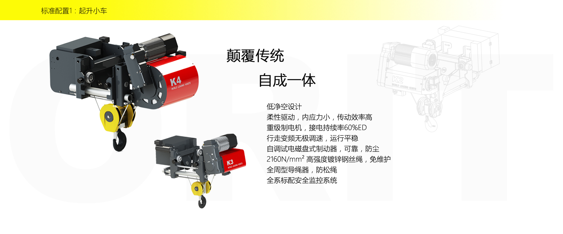产品名称:壁行式起重机 多层车间的最佳选择 优化设计,结构紧凑 变频控制,运行平稳 实时安全监控,确保吊运安全 占用空间小,工作面积大 集高强度低架构与一体,达到最大的提升设计 适用于5t以下额定载荷平稳、快速地起吊搬运。 标准配置1:起升机构 颠覆传统,自成一体 低净空设计 柔性驱动,内应力小,传动效率高 重级制电机,接电持续率60%ED 行走变频无极调速,运行平稳 自调试电磁盘式制动器,可靠,防尘 2160N/mm² 高强度镀锌钢丝绳,免维护 全周型导绳器,防松绳 全系标配安全监控系统 标准配置2:三合一驱动 静音科技,静享搬运 结构紧凑,铝合金壳体,密封 变频电机+硬齿面减速箱+盘式制动器 龙门专用C型三合一集成化设计,节约空间 全变频调速 最高转速4800 r/min 防护等级IP55 半油脂润滑,免维护 静音科技,静享搬运 标准配置3:电控系统 安全随心掌控 智能安全监控器 计算起升机构剩余安全工作时间 累计起升工作时间 累计超载次数 累计起升电机启动次数 起升电机过热保护及报警 刹车片厚度报警 ... ... 远程通讯 施耐德电气元件 航空插座接口 IP55防护等级 标准配置4:端梁 多变灵活,适应自如 模块化直驱设计 自重轻、体积小 QT700车轮,自润滑,更静音 采用调心轴承,适应更自如 双轮缘端梁与平轮端梁完美结合, 既满足受力要求, 又彻底的解决了三条端梁(轨道)可能产生的啃轨问题。 应用